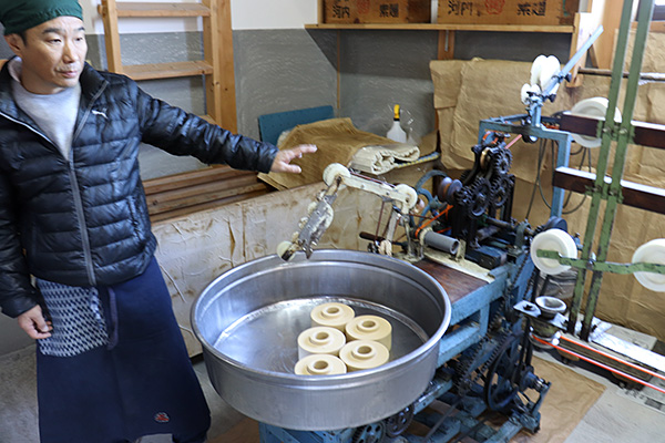 こねた生地はビール瓶くらいの太い麺にして、いくつもの種類の違う器械に通して、ひたすら延ばして、延ばして細くしていきます。小指くらいの太さになったのをさらに狭くしたローラーに通します。そこから出てきた麺を2本の細い金属棒に掛けるように巻きつけていきます。そこで、試し引きをする小引作業が入ります。試し引きをしておかないと、翌日、麺が伸びなくなるのです。