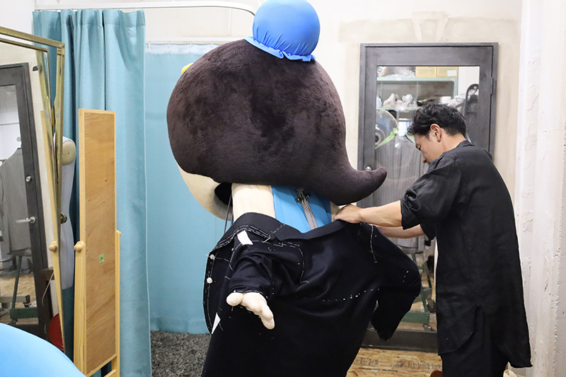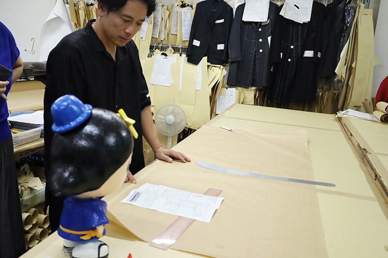 入りましたね。ひこぼしくんの場合は着丈を少し短くしたり、部分によってはもっと長くしたり。男性の場合はジャケットの裾を絞ってシルエットを作りますが、ひこぼしくんは絞りませんでしたね。ズボンのシルエットも調整して、「よし!ひこぼしくんの体型にフィットした、おしゃれなスーツができる」と確信しましたね。