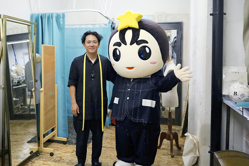 この工場では、個人のオーダーメイドスーツの注文も受けているんだ!そして今回はなんと、このファイブワン・ファクトリーさんが僕、ひこぼしくんのスーツを作ってくれました!すごいでしょう?ぼくのスーツがどのようにして作られたのか、工場長の岩下信之さんに工場を案内していただきました!