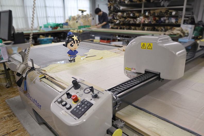 次に、生地を裁断します。さあ、こちらが裁断機です。無地と縞柄の生地は自動裁断機でカットします。