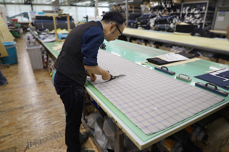 格子柄の場合は、縦と横の柄をきちっと合わせる必要があるので、職人が1点1点線を引いて裁断