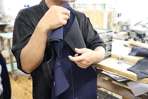 紳士服ならではの前身ごろの芯据え作業で、上半身のシルエットを整える