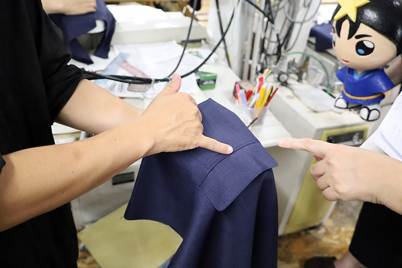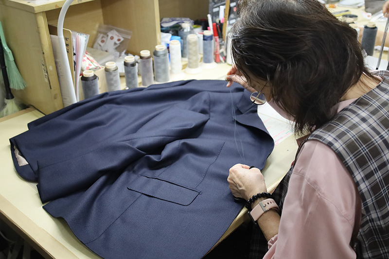 手縫いする場合もありますよ。弊社は「ハイクオリティオーダー」といって、リクエストに応じて衿と袖付けを手縫いで行うサービスを行っています。