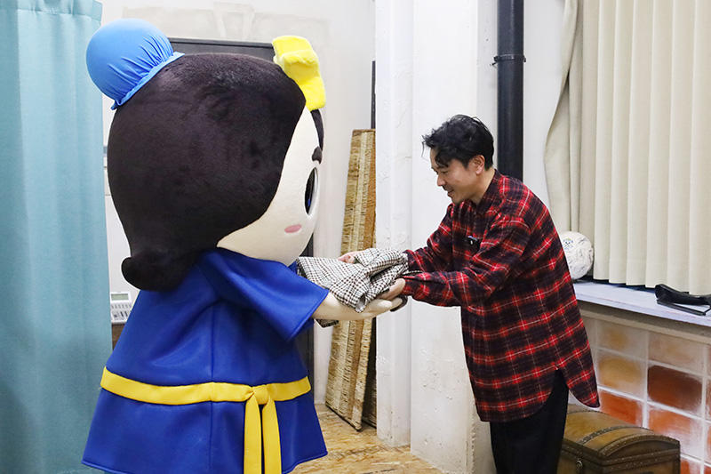 岩下工場長より仕上がったスーツを受け取るひこぼしくん