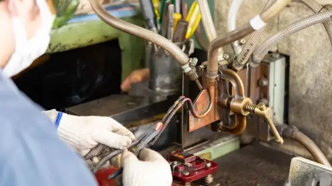 内藤さん エアーニッパの本体内には、バネとピストンが入っていて、足部は、そのピストンと接触する部分になるので、しっかり磨いています。昔は全部人の手で磨いていましたが、出荷量が増大し、この多関節ロボットを導入しました。