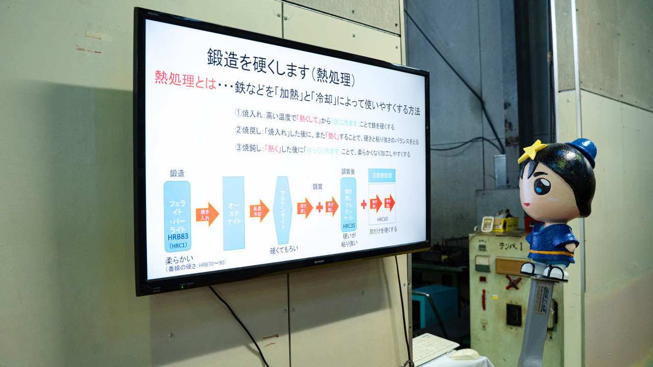 では、こちらのモニターで熱処理の工程をご覧いただきます。まず「焼入れ」。高温で熱した鉄を急激に冷やすことで、鉄が硬くなります。でもまだ不十分なので、再度加熱します。これが「焼戻し」で、硬く粘り強くなります。そうすることで少し柔らかくなります。