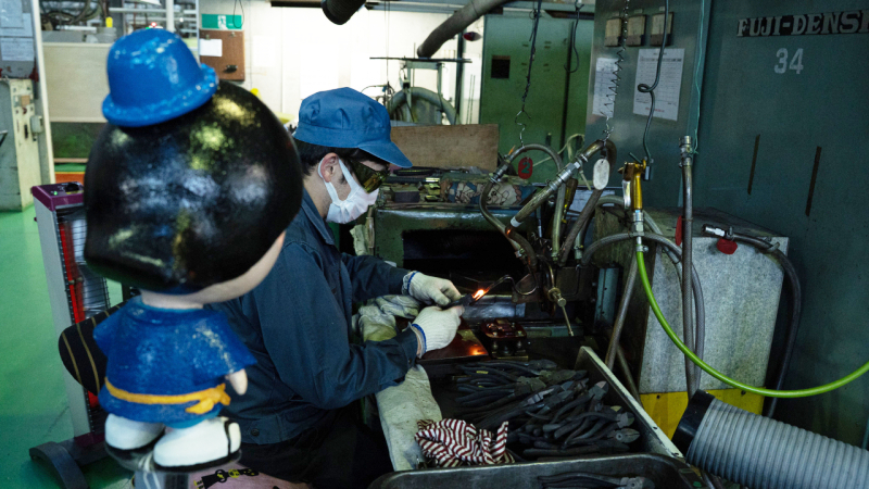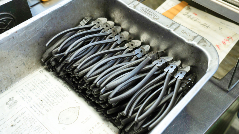 舩戸さん ここから「熱処理」を行っていきます。今の6つの工程を経て、さらにニッパとして鉄の強度を高めるため、「加熱」と「冷却」を繰り返していきます。これを「熱処理」と言います。