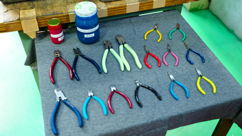 長谷部さん 発色がいいでしょう。ビニルを溶かした溶剤をニッパの持ち手部分に付着させると、グリップになります。この工程は機械化しています。