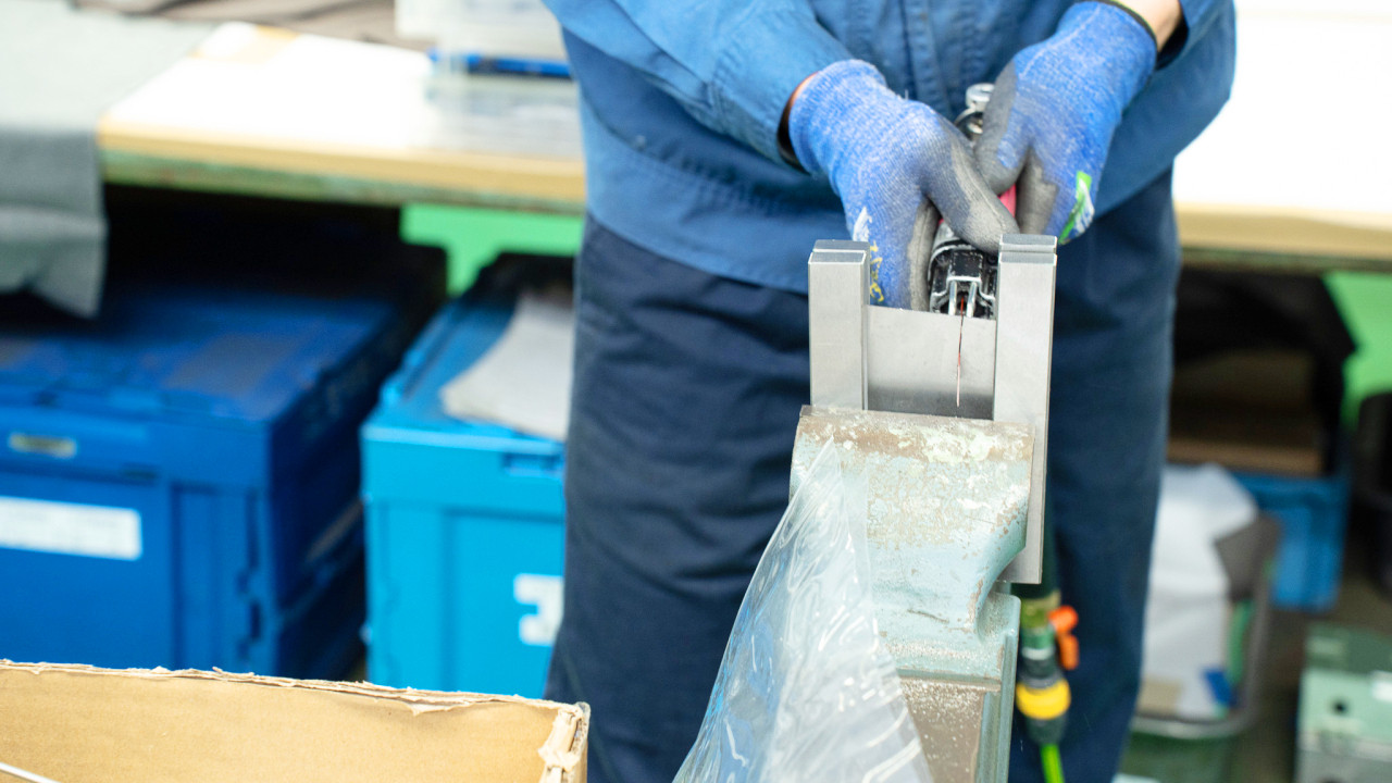 髙橋さん ここはブレードラインといって、先ほどご覧いただいたエアーニッパの替刃を作っています。では一度、エアーニッパで切ってみますね。