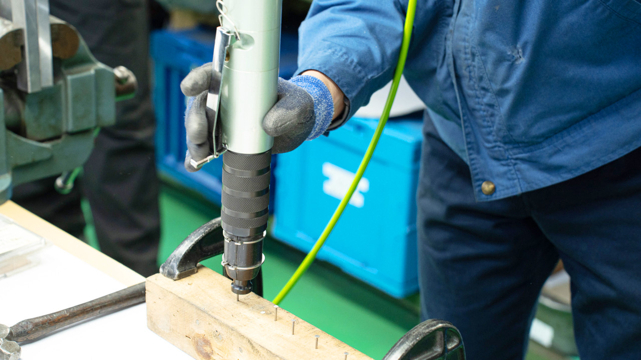 髙橋さん 先ほど、エアー工具は空気の圧力を利用しているとご案内しましたが、詳しくは、空気の力によって刃を閉じる仕組みになっています。空気が送られる一瞬の音が「シュッ」です。瞬間的な空気の圧力はすさまじいので、太い鉄線も指一本で切れます。