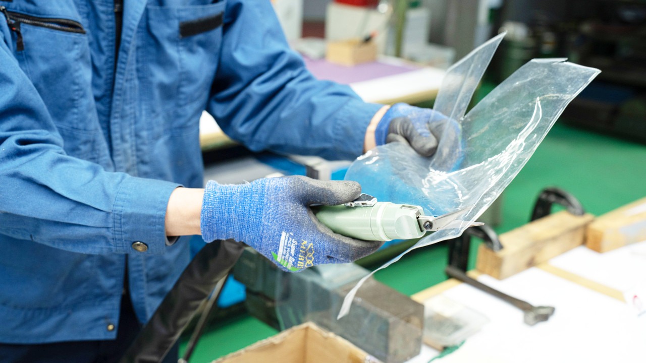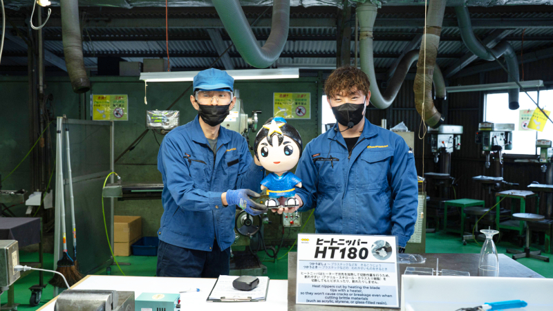 江野さん 約150度です。普通のニッパで切るとパチンと割れて破片が飛び散りますが、ヒートニッパはそんな心配はいりません。炊飯器の蓋やカードケースなど、いろいろなプラスチック素材が切れます。割れないし、切った部分も白濁しないので、樹脂成型業者の方によく使われています。さらにヒートハンド工具のニッパをつくっている国内メーカーは室本鉄工のみです。