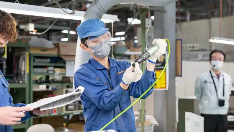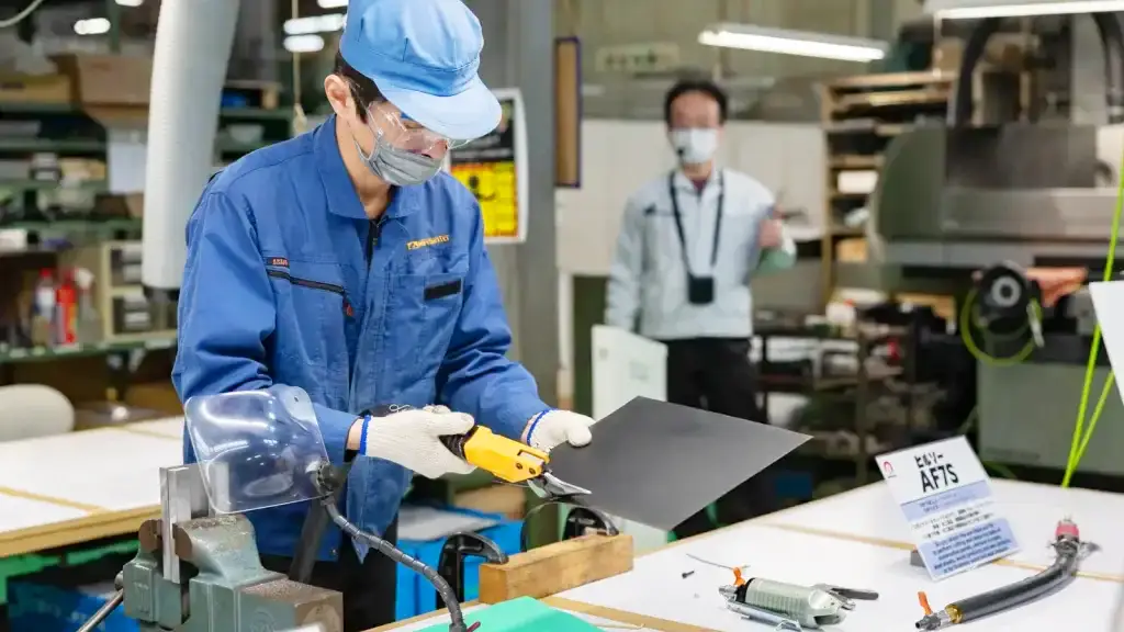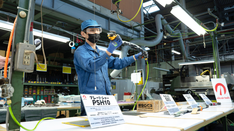 社長 はい。でも人の手でしかできない工程もたくさんあります。それでは職人たちがどのようにして作っているか、メリーハンド工具とナイル空気工具、そしてエアーニッパの替刃の3つの工程を、工場でご覧いただきましょう。案内人は実際に働く職人たち。気になったことはどんどん質問してください。
