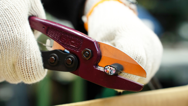 社長 これが「メリーカッタ」です。ホースやケーブルなど軟材と呼ばれる柔らかい物を切ることができます。では実際にケーブルを切ってみます。
