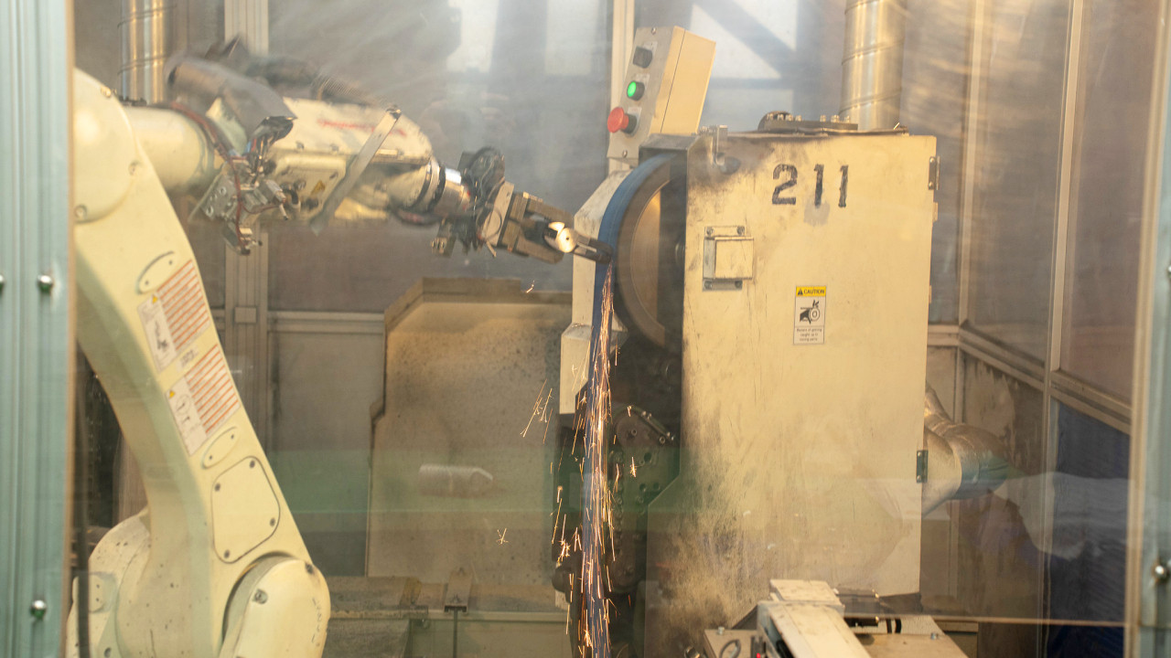 多関節の工業用ロボットが替刃の足部を磨いている
